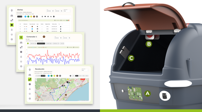 La información se almacena en una base de datos encriptada y exclusiva para cada Ayuntamiento: número de aperturas, tapa abierta o cerrada, temperatura interior, volumen de llenado, alarmas e incidencias.
